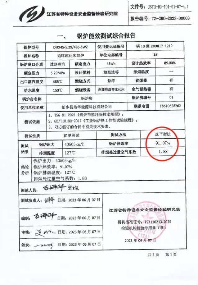 2023年6月,柏乡县热华能源科技有限公司聘请权威机构对2020年4月投入运营的45t/h燃生物质锅炉开展了能效测试。《锅炉能效测试综合报告》显示:锅炉热效率高达91.07%,超过国家一级能效标准要求的91%热效率。