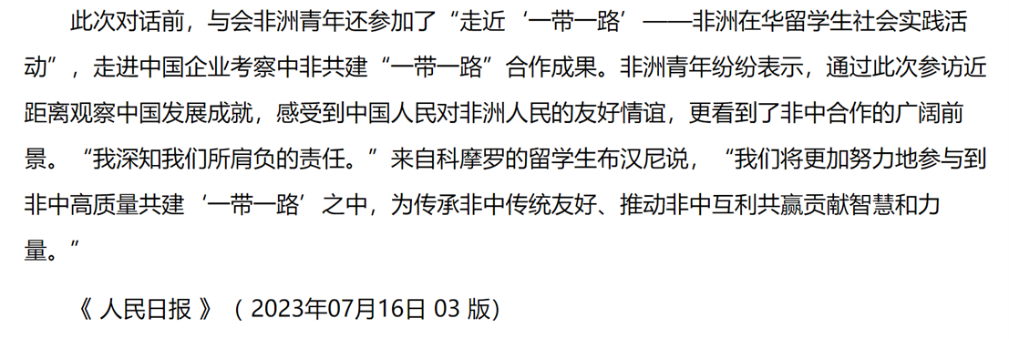 “我深知我们所肩负的责任。”来自科摩罗的留学生布汉尼说,“我们将更加努力地参与到非中高质量共建‘一带一路’之中,为传承非中传统友好、推动非中互利共赢贡献智慧和力量。”